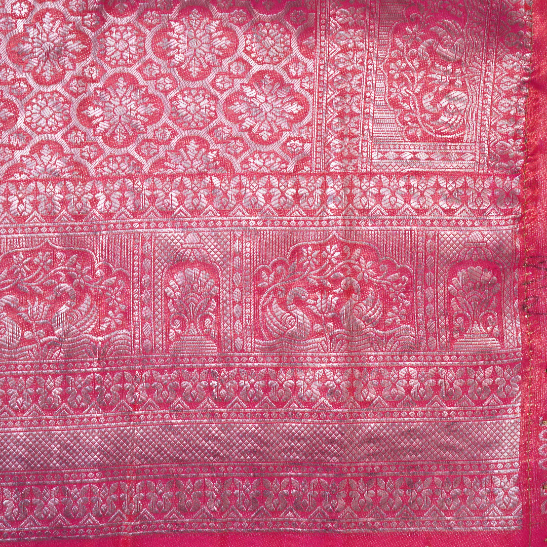 This striking saree is showcased in a vibrant magenta pink hue with a radiant, festive sheen. Crafted from a Banglori Silk fabric, it offers a smooth drape and a rich, elegant feel. The body is adorned with intricate silver zari floral and vine motifs, beautifully woven to add depth and texture, while a subtle zari border and tasselled pallu complete the look. Perfect for festivals, celebrations, and special occasions, this saree brings together bold colour and timeless craftsmanship.