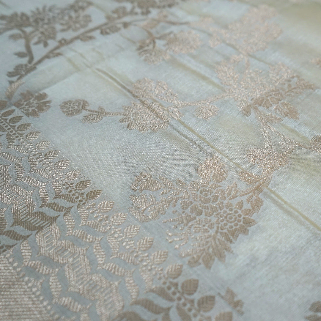 This elegant saree is showcased in a soft ivory-beige tone with a subtle, graceful sheen. Crafted from a lightweight Tissue Silk fabric, it drapes effortlessly and feels refined against the skin. The body features delicate gold zari floral vine motifs, tastefully woven to create a balanced and timeless pattern, complemented by a neatly finished zari border. Ideal for day functions, festive occasions, and traditional gatherings, this saree embodies understated elegance and classic charm.