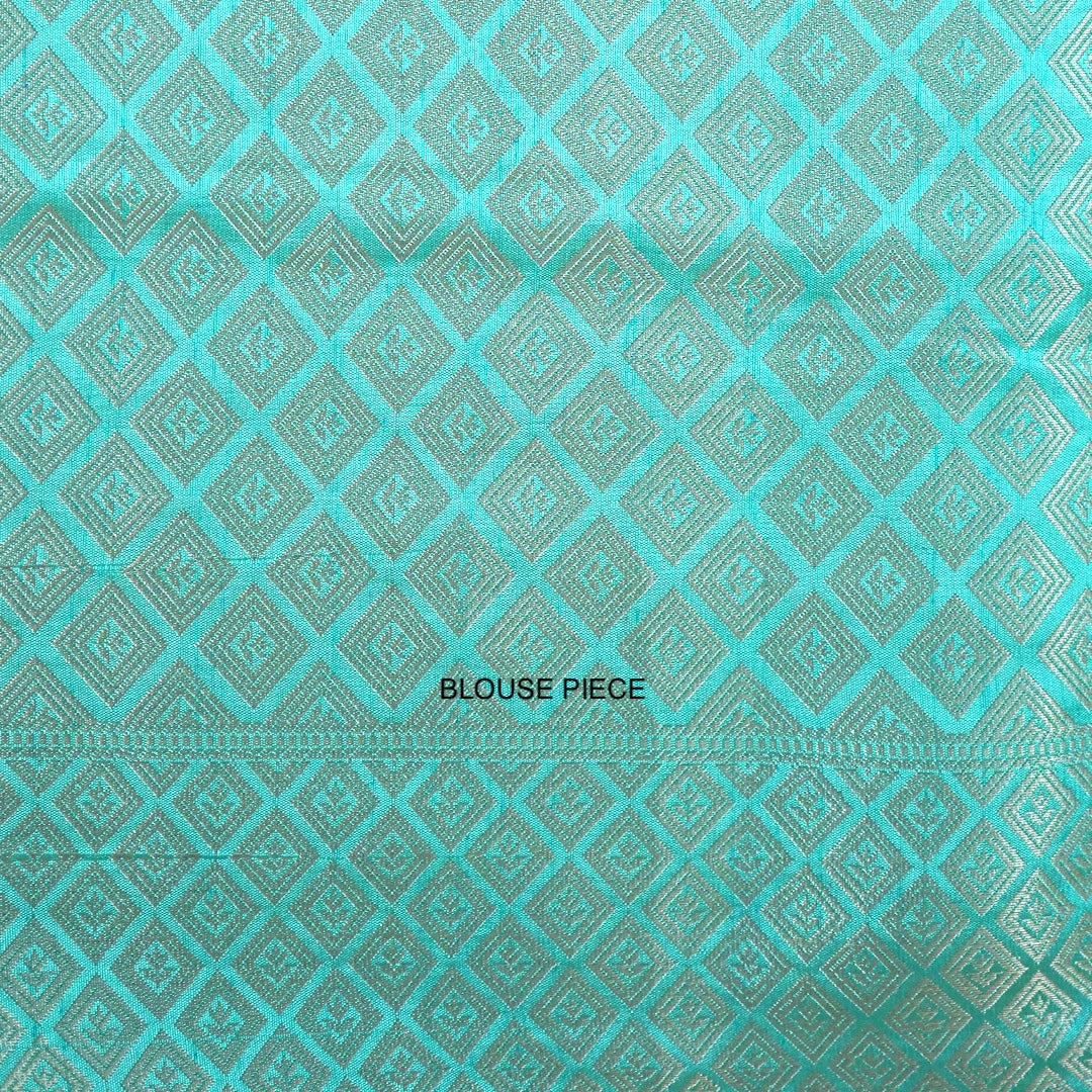 This graceful saree comes in a refreshing aqua blue shade that radiates calm elegance. Crafted from a smooth Tissue Silk fabric, it offers a lightweight feel with a soft, fluid drape. The body is adorned with subtle silver zari floral motifs, adding a refined touch without overpowering the look. A geometric zari-woven border enhances the saree with structured elegance, creating a perfect balance of tradition and modern design.