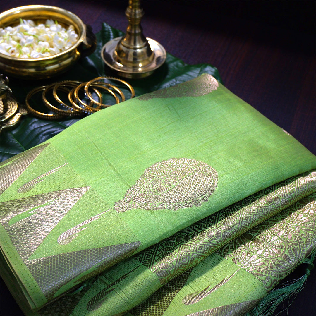 This elegant saree is presented in a fresh leaf-green hue, reflecting natural grace and festive charm. Crafted from a fine Tissue Silk fabric, it offers a smooth texture with a light, comfortable drape. The body features intricate zari-woven paisley and traditional motifs, adding subtle richness to the design. A delicately detailed zari border enhances the overall look, while the coordinated pallu with soft tassels lends a refined finish.