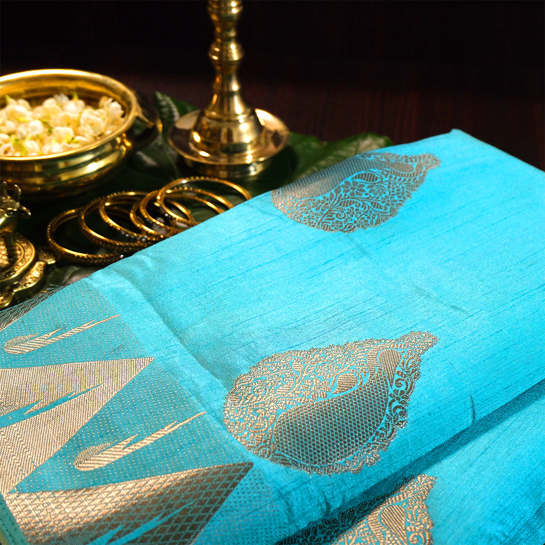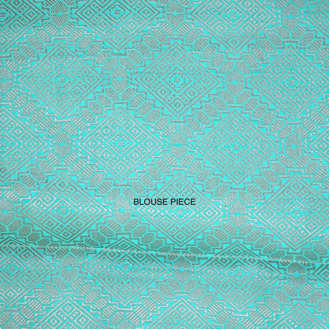 This refreshing saree features a vibrant aqua blue hue that brings a bright, youthful elegance to your wardrobe. Crafted from a Tissue Silk fabric, it offers a lightweight feel with a smooth, comfortable drape. The body is embellished with graceful silver zari paisley motifs, adding a subtle shimmer without overpowering the design. Ideal for festive occasions, daytime celebrations, and elegant casual wear, this saree beautifully balances tradition with modern appeal.