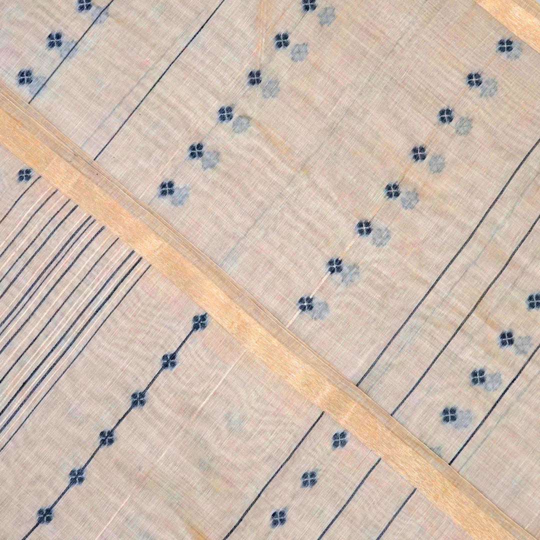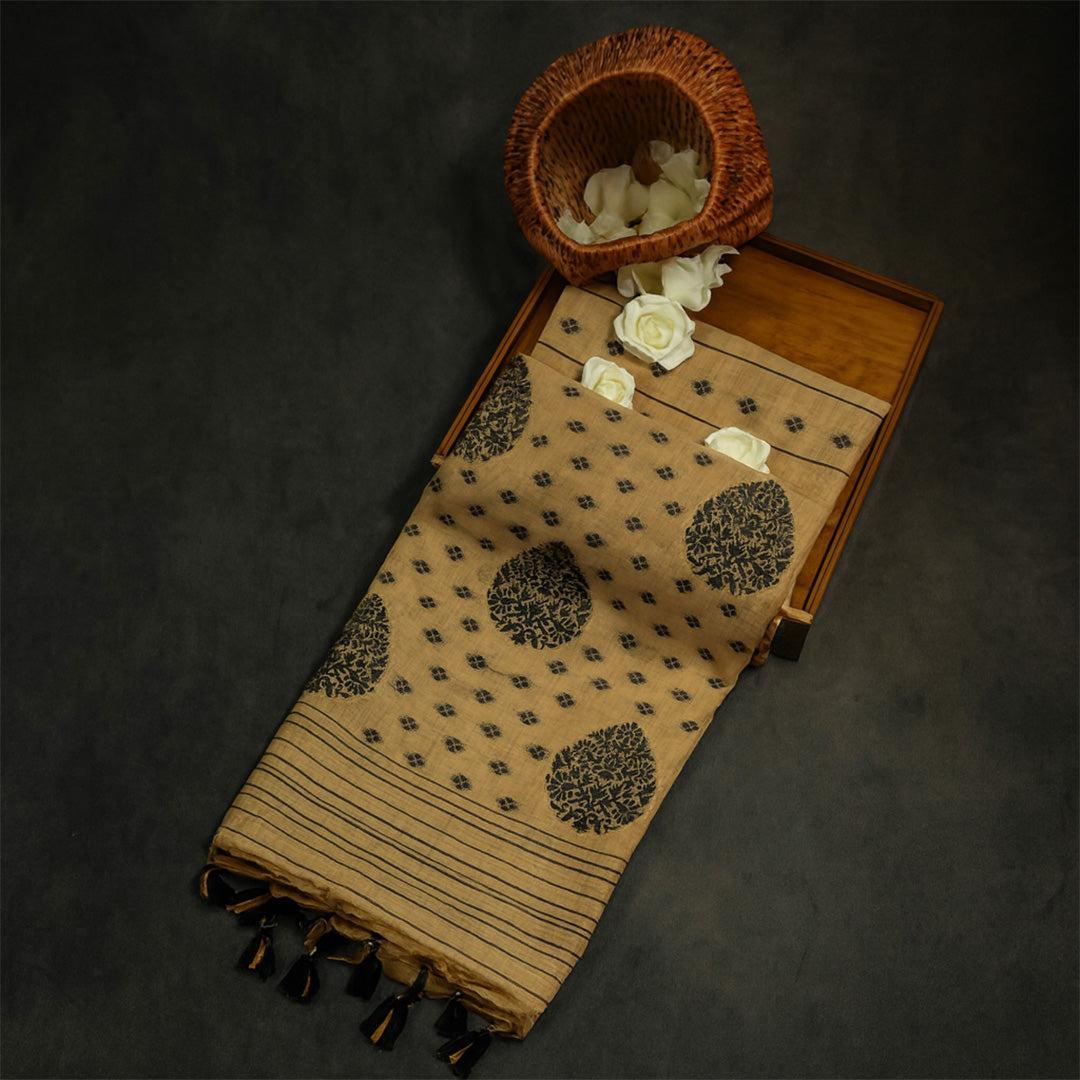 Grace meets simplicity in this Ishvani Tussar Saree, handwoven in a soothing beige base with exquisite black threadwork motifs. The saree features delicate small floral buttas arranged in vertical patterns across the body, complemented by bold paisley-inspired motifs on the pallu. Subtle striped detailing and black tassels at the edge enhance its refined charm. A perfect balance of minimalism and tradition, ideal for elegant daytime occasions or artistic gatherings.