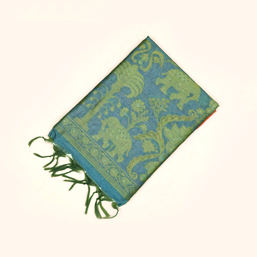 This stunning Ambari Silk saree masterfully combines warm and cool tones, featuring a graceful coral/salmon pink body highlighted by delicate, scattered gold zari floral buttas. This warm canvas is dramatically framed by a striking slate blue pallu and border, which are intricately woven with rich, traditional zari work showcasing prominent elephant (gaja) motifs alongside opulent floral and vine patterns. The captivating contrast and luxurious silk texture make this saree a perfect, regal choice for special occasions.