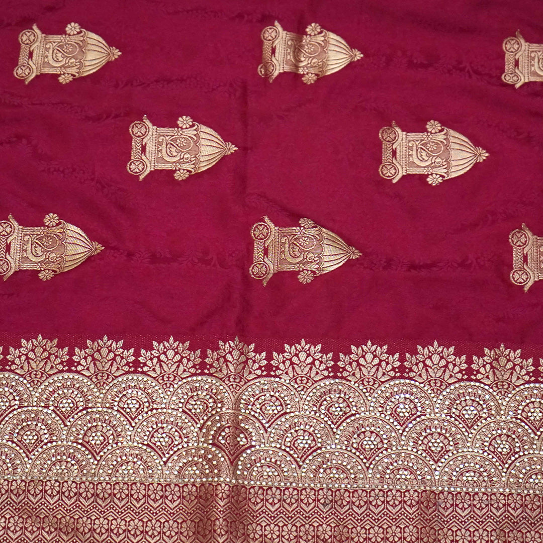 Royal Ratha Banarasi silk in deep maroon red shade, highlighted with rich golden zari motifs and an ornate golden border.