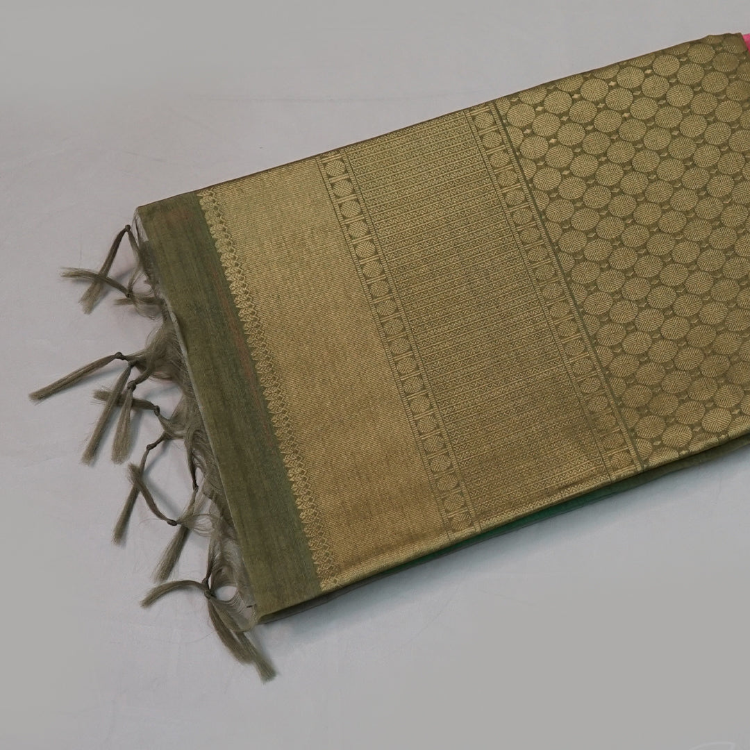 This elegant saree features a vibrant pink body with subtle woven patterns, paired with a green pallu and border adorned with traditional zari motifs of nandhi and floral designs. Crafted from rich Tussar silk, it offers a soft texture with a natural sheen. The contrasting zari border adds a touch of regal charm, perfect for festive and traditional occasions.