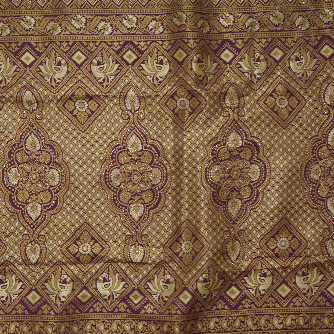 Experience the majestic charm of the Raj Virasat Silk Saree, a true heirloom piece balancing subtle elegance with breathtaking grandeur. The luminous body in Pista Green (or Pale Lime Green) features a sophisticated, tone-on-tone diamond jacquard pattern interspersed with delicate Zari Butis. This serene canvas is beautifully contrasted by a magnificent, wide border in Deep Aubergine Purple, heavily woven with Gold Zari depicting traditional motifs like peacocks and paisleys.