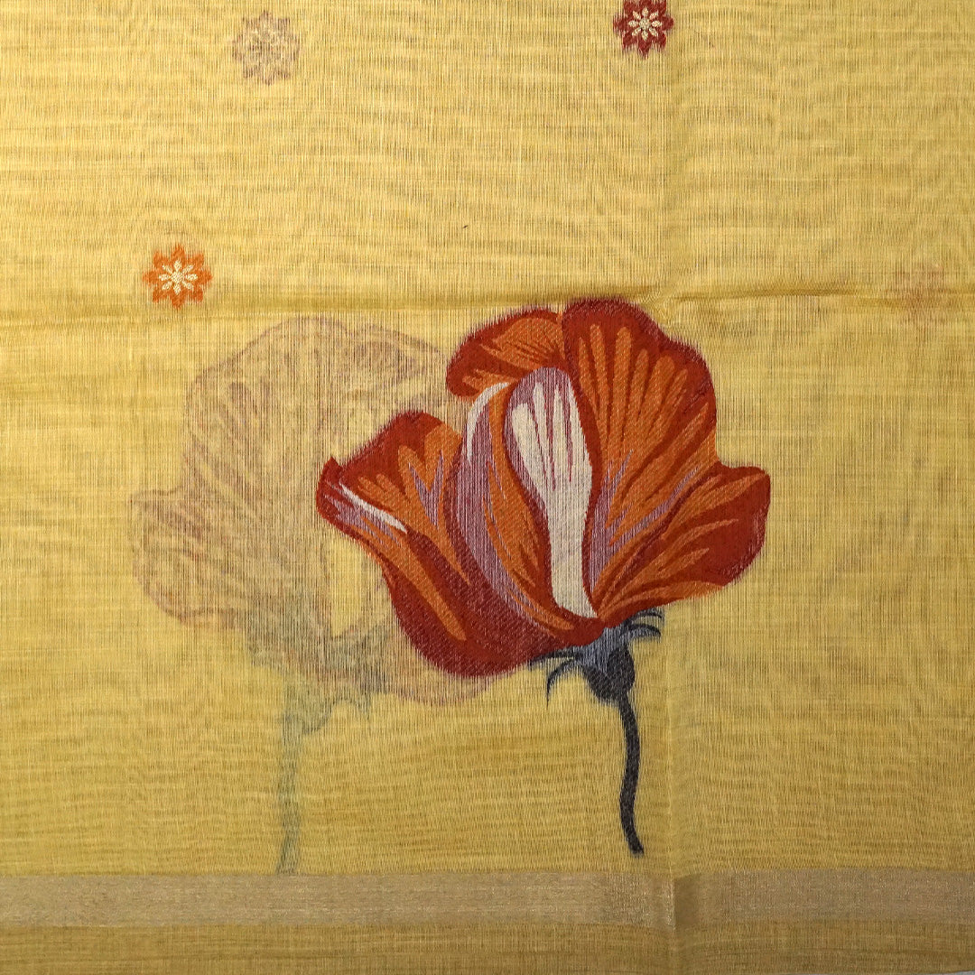 This elegant saree features a soft pastel yellow linen-silk base with a lightweight, breathable drape. Adorned with hand-painted floral motifs in orange and red, it exudes artistic charm. A delicate silver zari border and golden-yellow tasselled pallu add refined elegance, making it perfect for festive and daytime occasions.