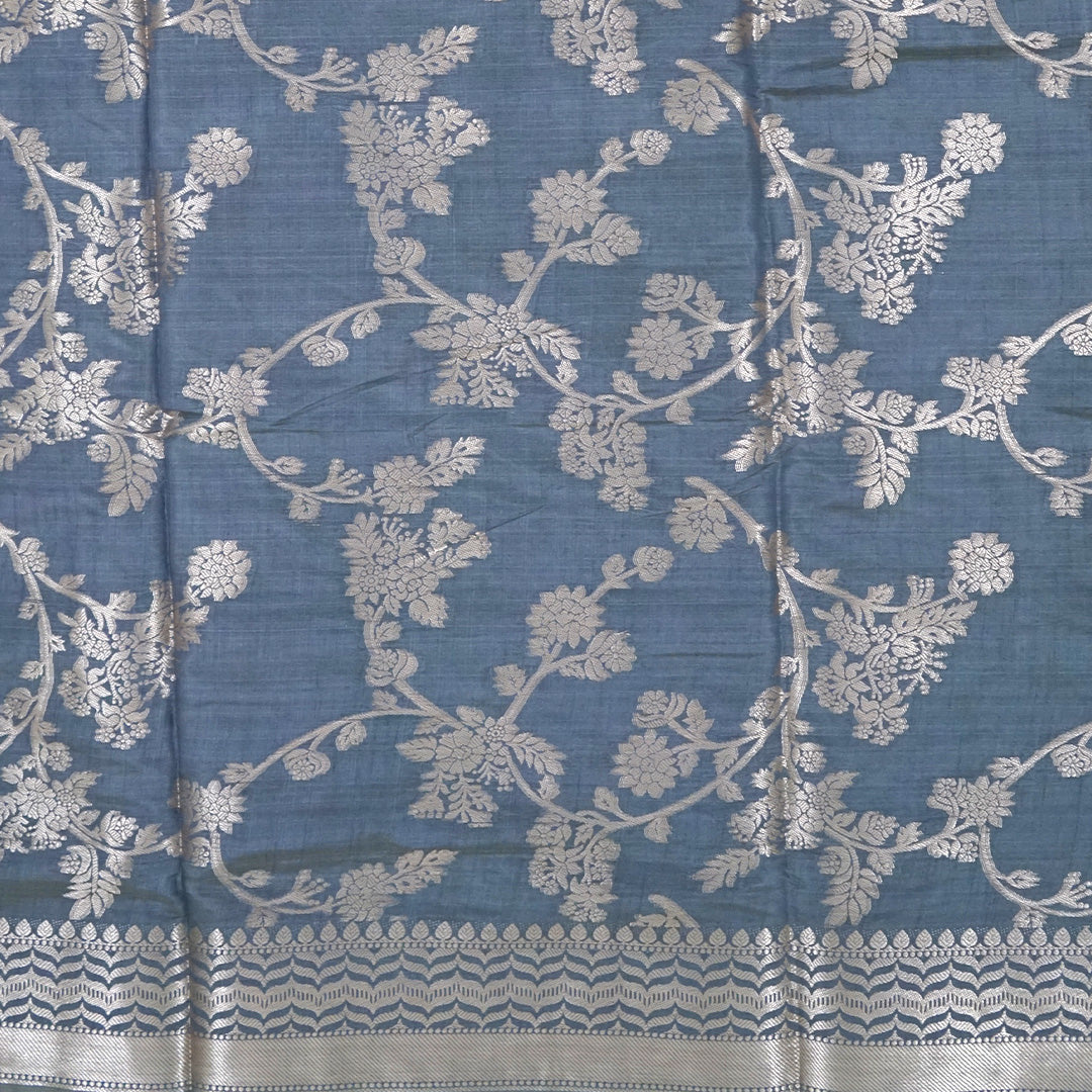 This graceful saree comes in a muted slate blue-grey tone with a subtle, elegant sheen. Crafted from Tissue Silk fabric, it offers a smooth drape and comfortable wear. The saree features delicate silver zari floral vines woven across the body, paired with a refined silver zari border that adds understated sophistication. Perfect for festive gatherings, formal events, and elegant day functions, this saree blends minimal charm with timeless tradition.