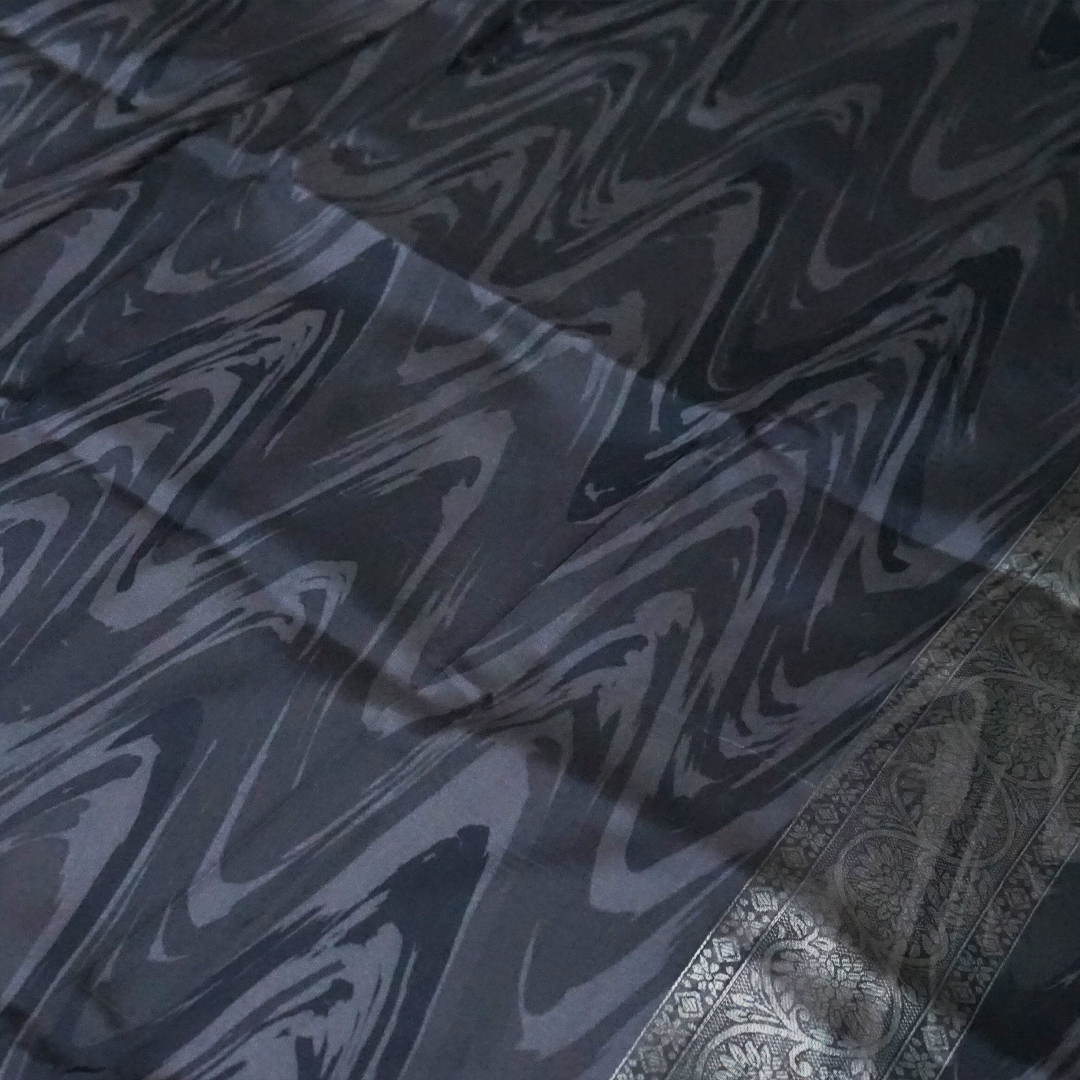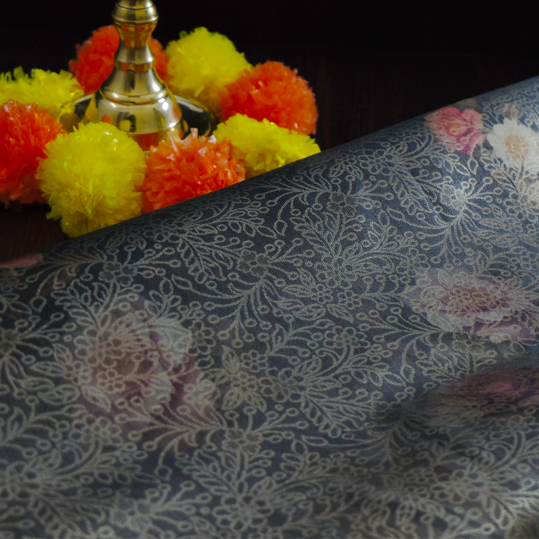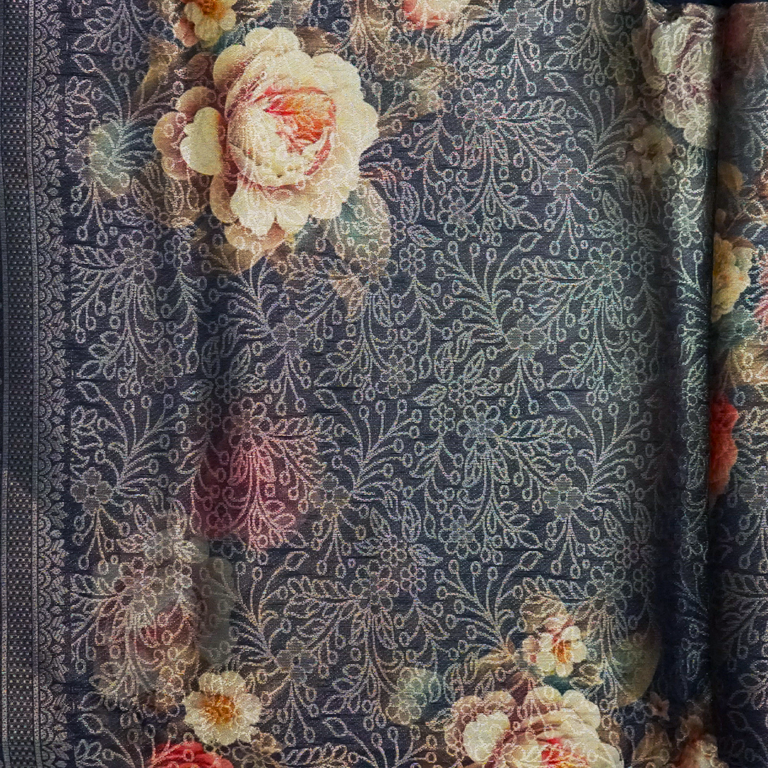This elegant saree features a rich black and antique gold base with a detailed woven botanical pattern in soft gold, rust, and muted red tones. Crafted from a premium silk-blend fabric with a jacquard texture and tasseled pallu, itโs perfect for festive and evening occasions.