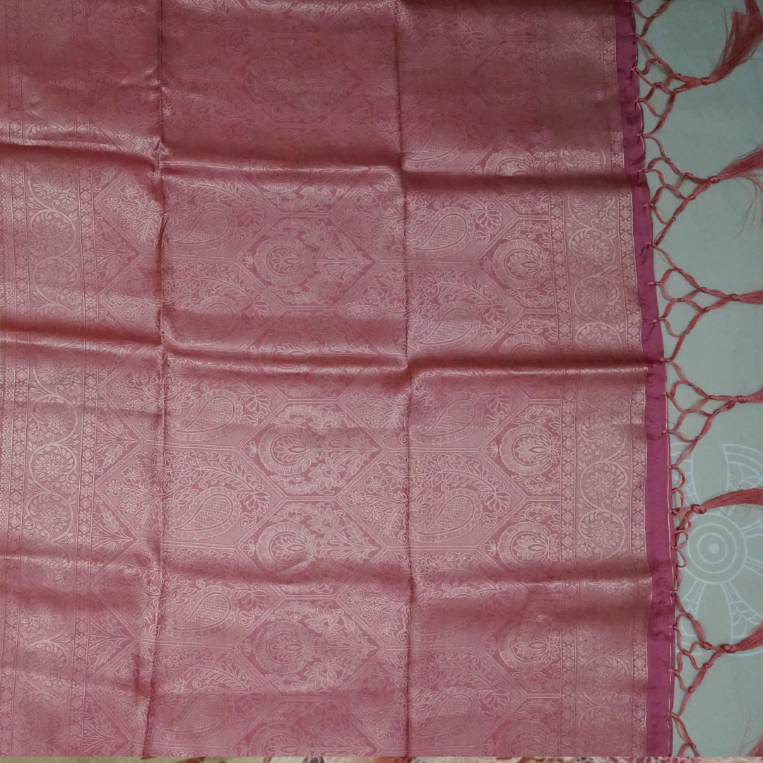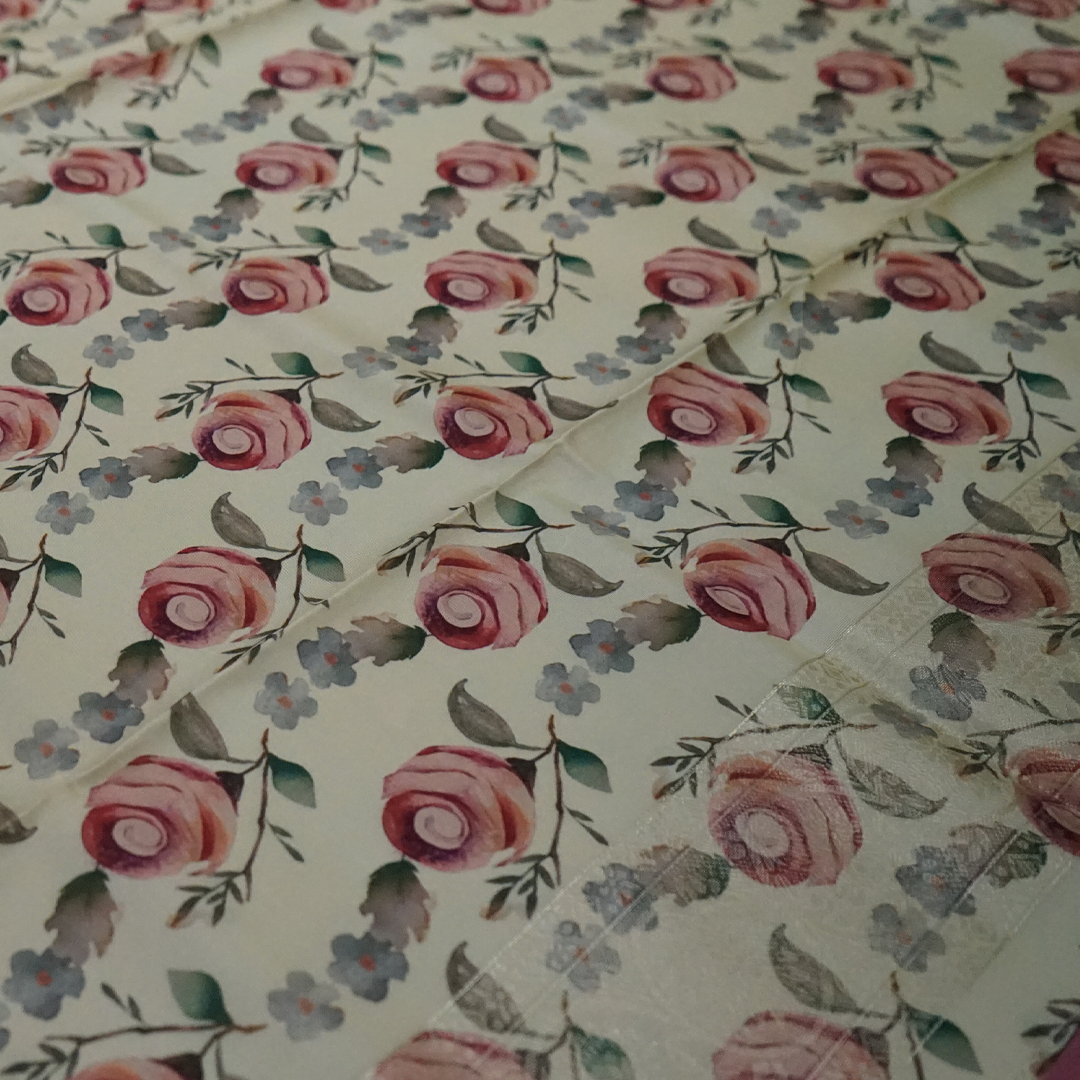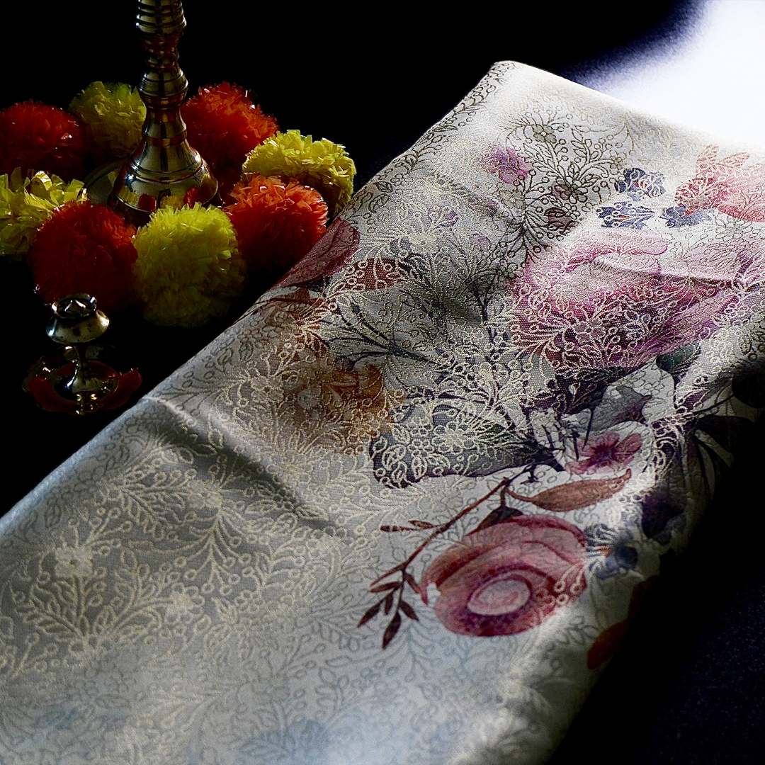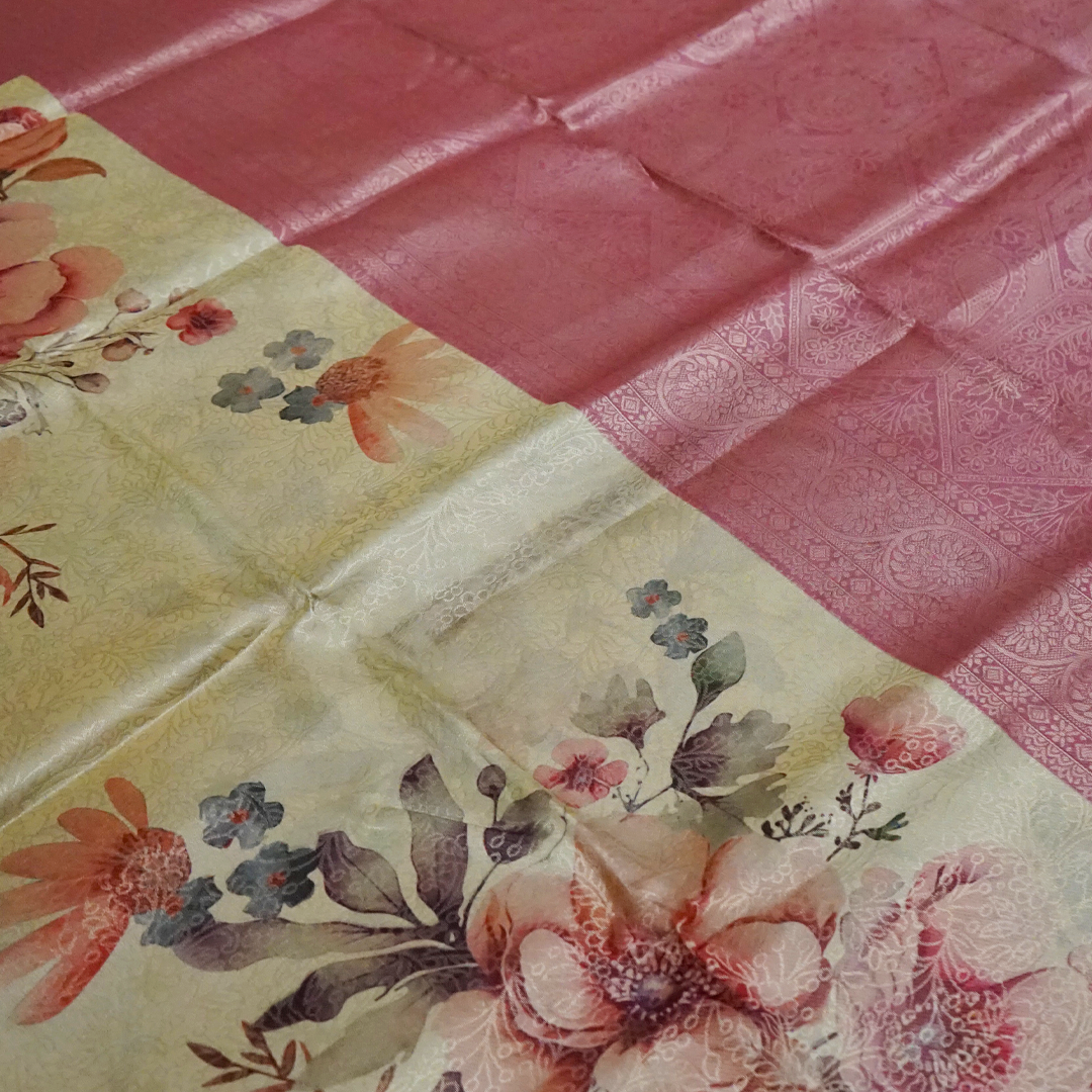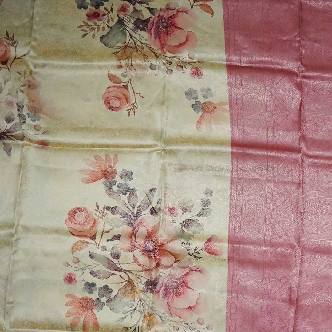 This elegant saree features a rich golden beige silk-blend base with beautiful floral prints in peach, rust, and soft pink, accented with hints of green. Its smooth drape and tasseled pallu add a refined touch, making it perfect for festive and special occasions.