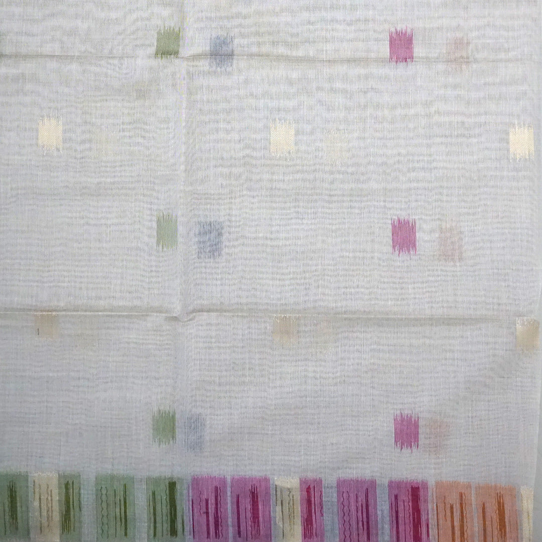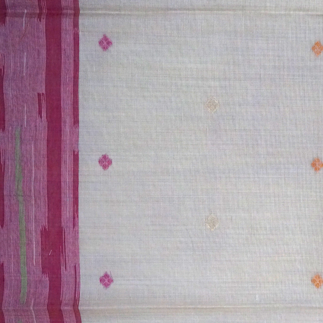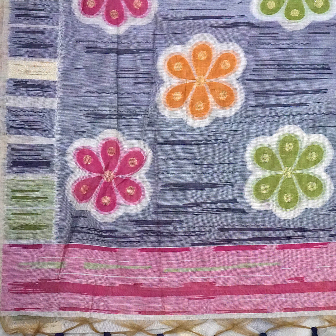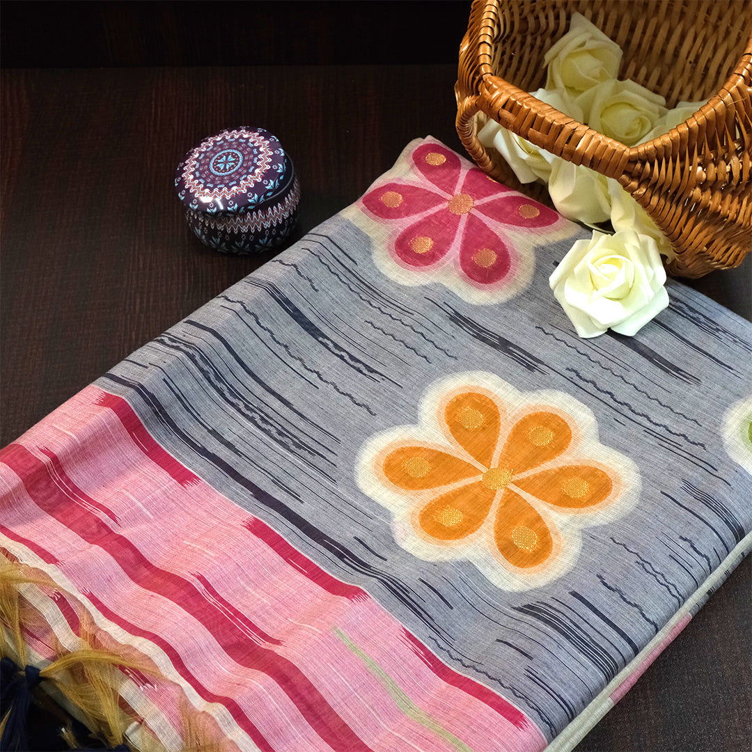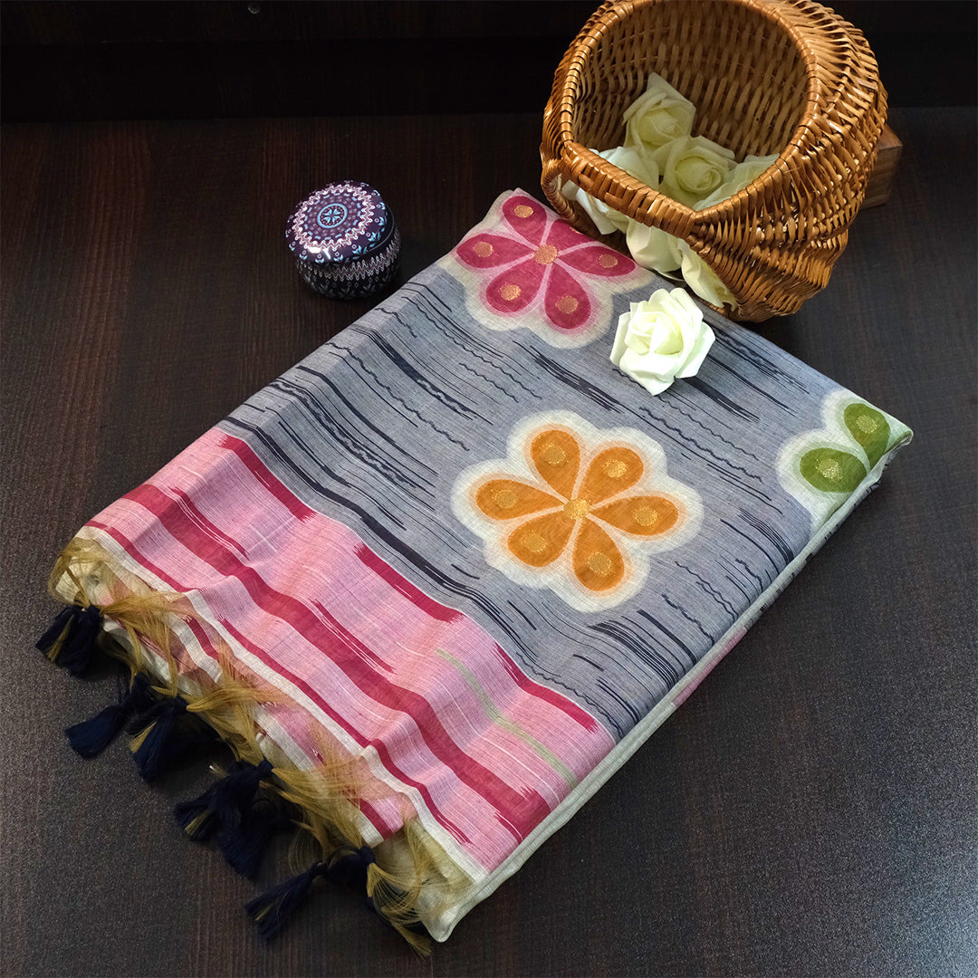This elegant saree features a chic slate-grey linen-silk base with a light, airy drape. Adorned with abstract floral motifs in orange, pink, and yellow with a soft halo effect, it exudes artistic charm. The striped pallu in pink, magenta, and ivory adds a vibrant contrast, while navy-blue tassels complete the look—perfect for festive and daytime occasions.