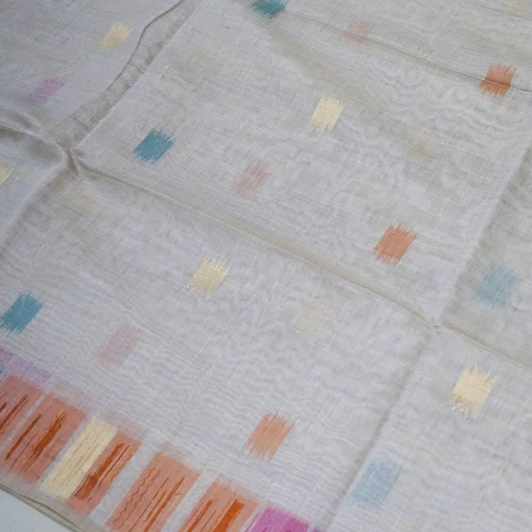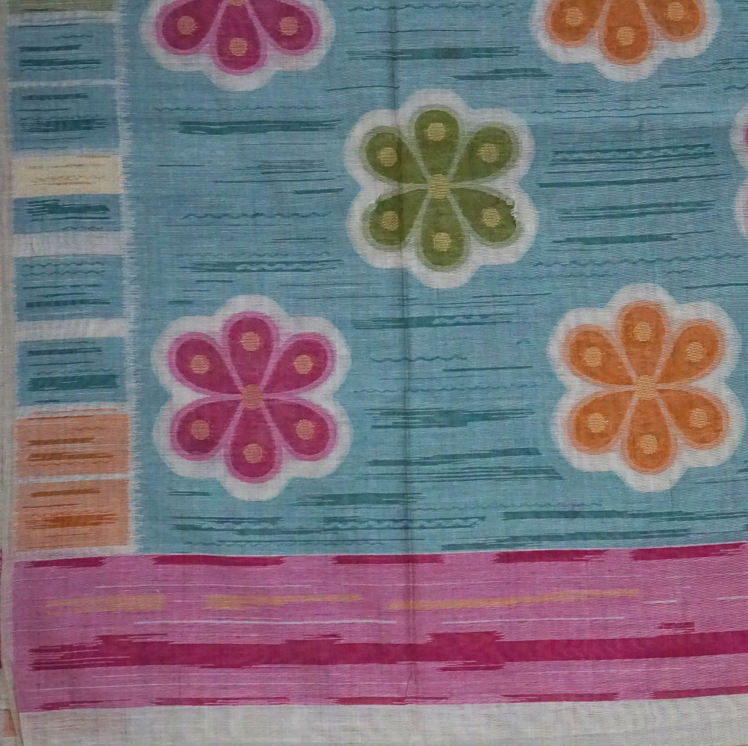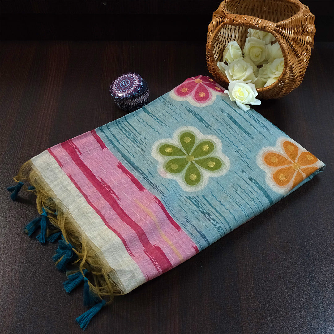 This cheerful saree features a refreshing aqua-blue linen-silk base with a soft, lightweight drape. Playful abstract floral motifs in green, orange, and pink enhance its artistic charm, while a striped pallu in pink, magenta, and ivory adds a vibrant touch. Finished with matching blue tassels, itโs perfect for festive and daytime occasions.