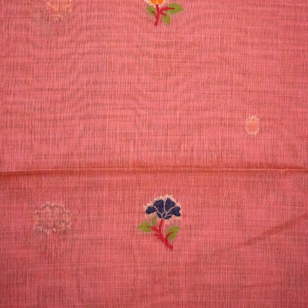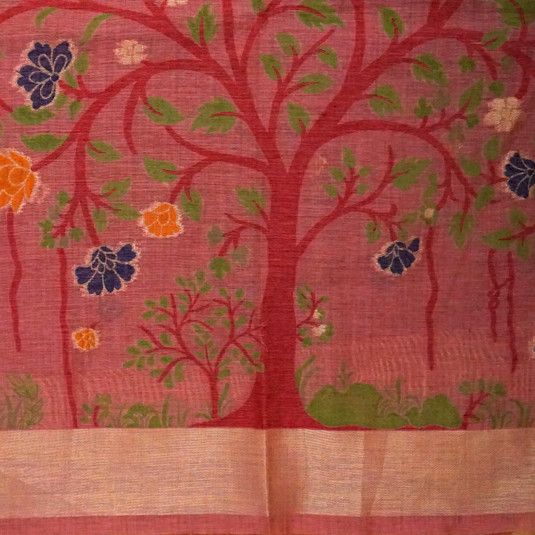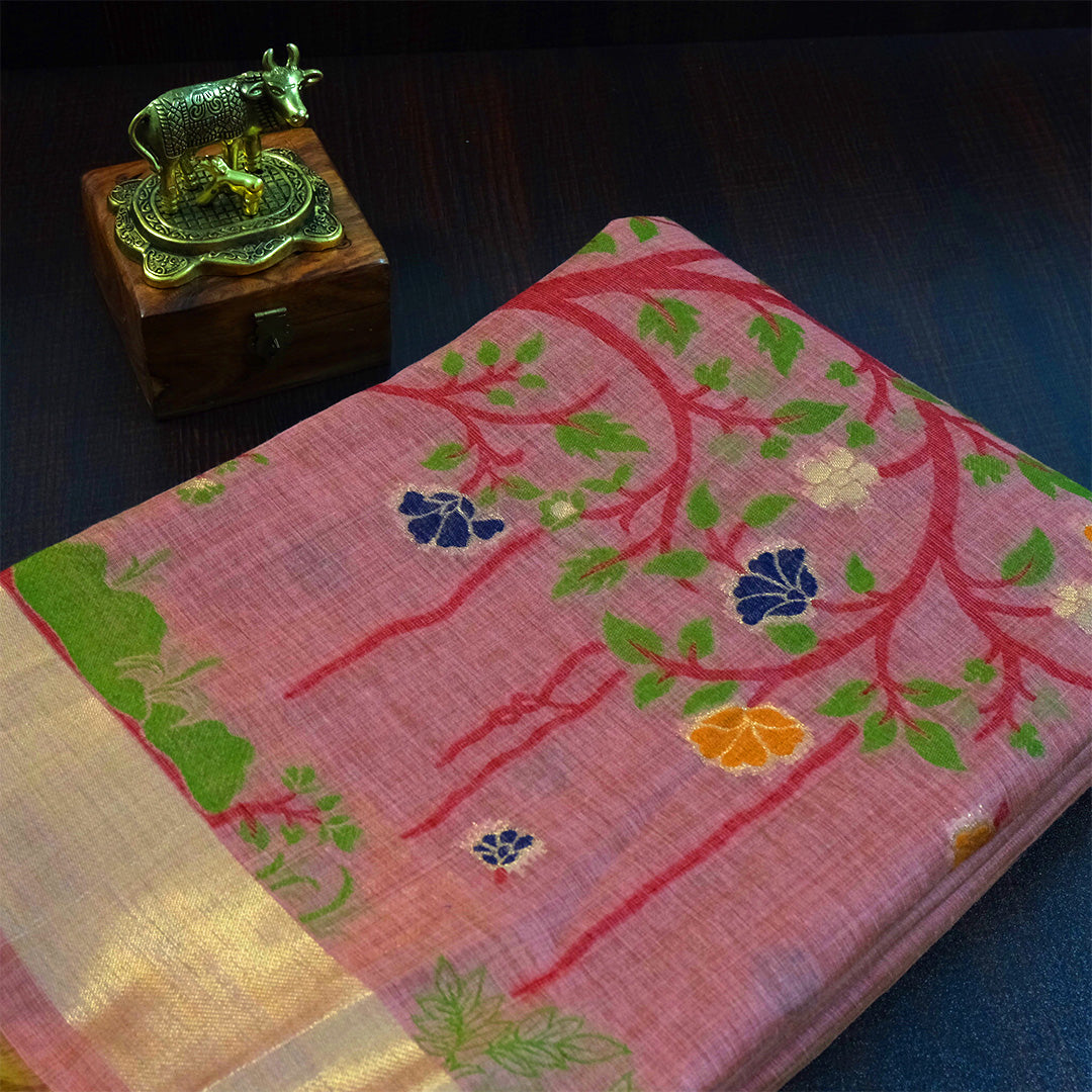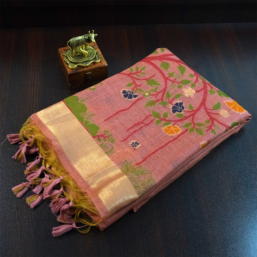 This elegant saree features a soft peach-pink linen-silk base with a lightweight, graceful drape. The body is beautifully adorned with hand-painted floral motifs in green, navy, orange, and yellow, arranged in artistic tree-branch patterns. Finished with a golden zari border and tasseled pallu, itโs perfect for festive and daytime celebrations.