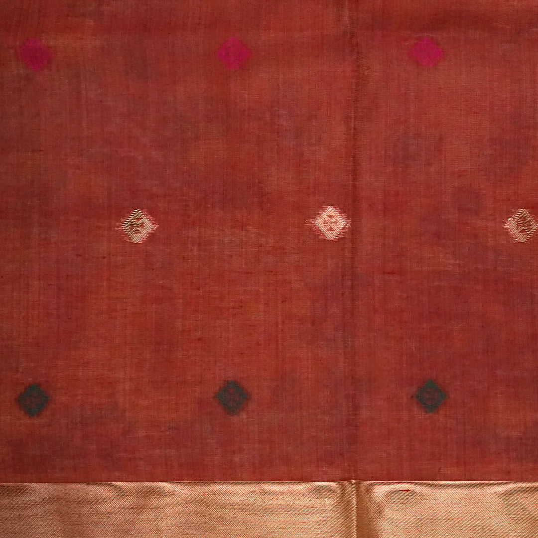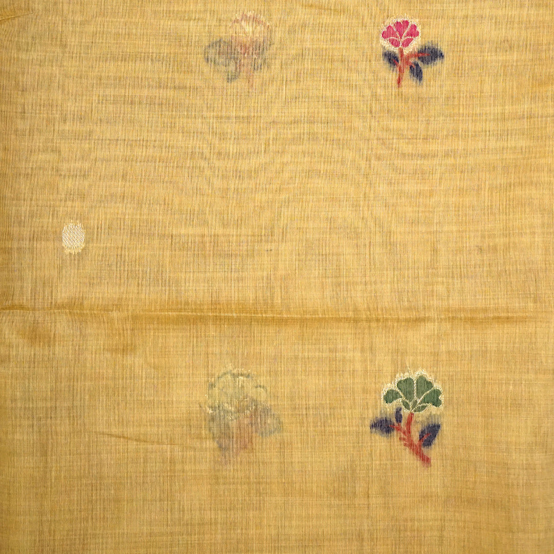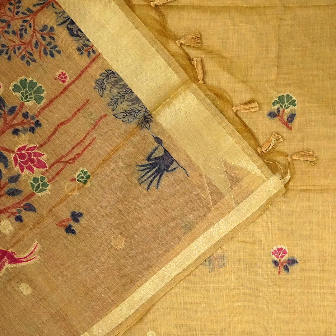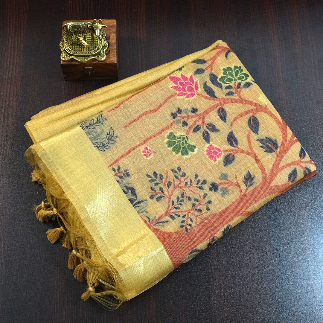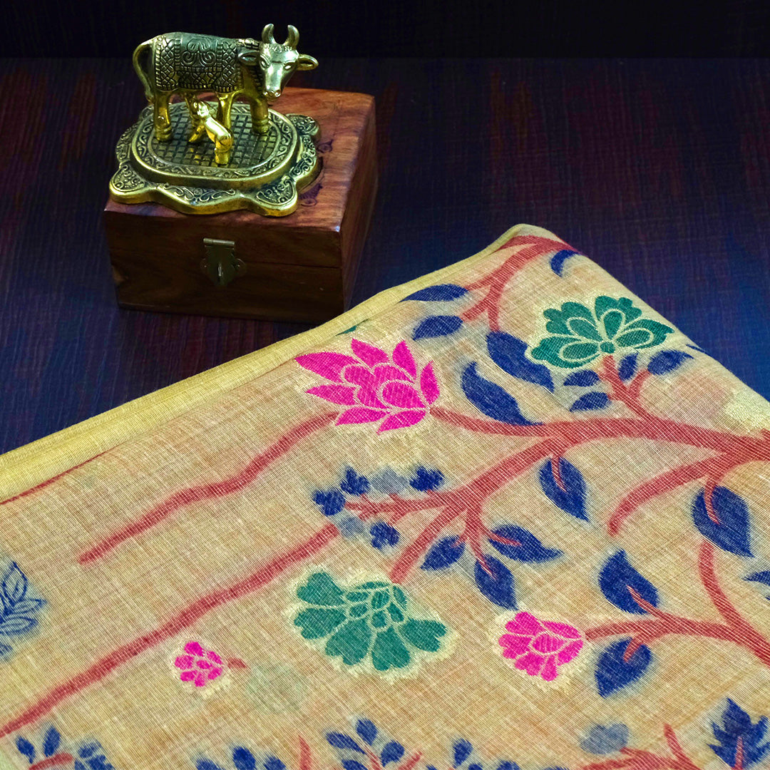This elegant saree features a warm mustard-gold linen-silk base with a soft, breathable drape. The hand-painted floral design with lotus and leafy motifs in pink, green, navy, and coral adds artistic charm. Finished with a solid pallu and tasseled edges, itโs perfect for daytime events and cultural celebrations.