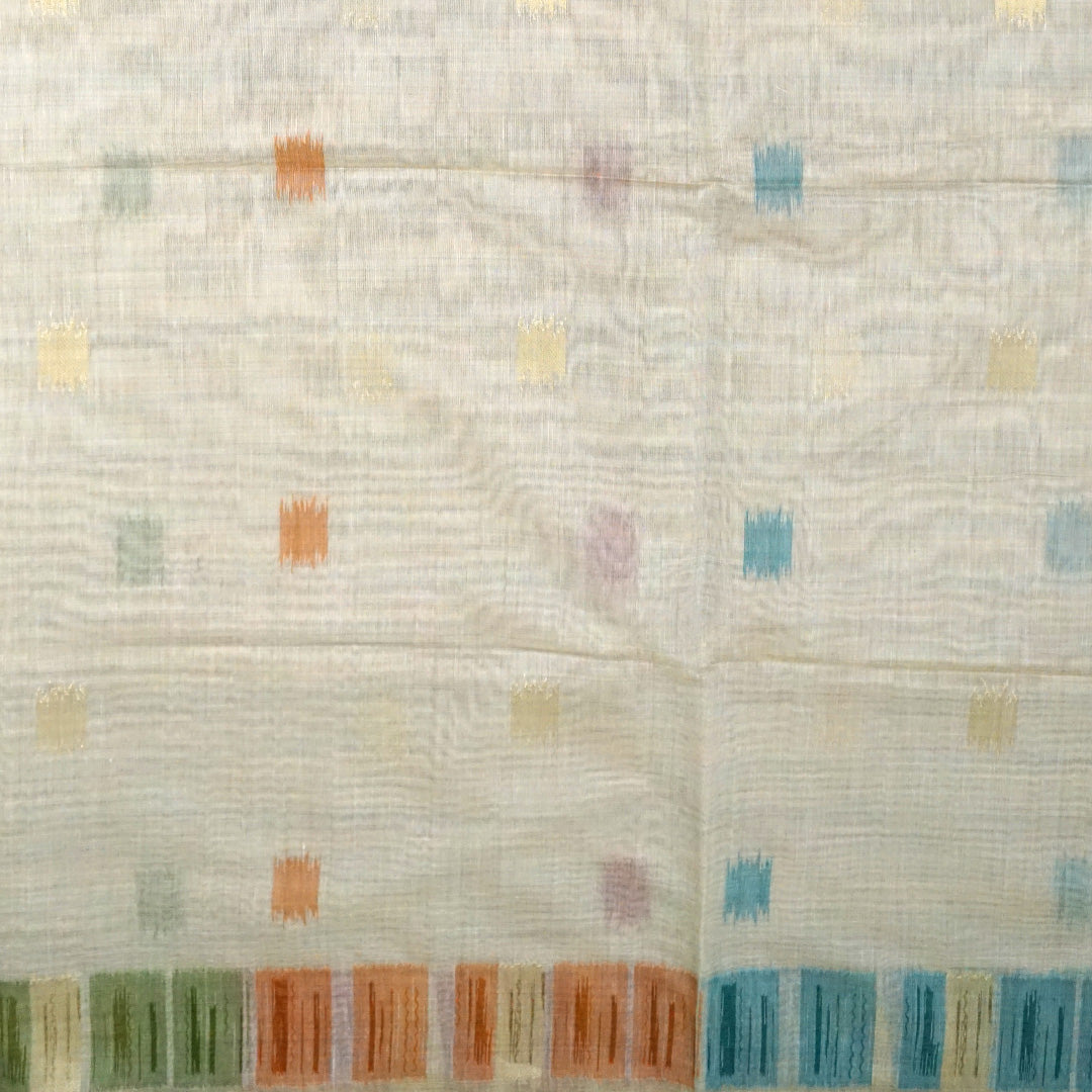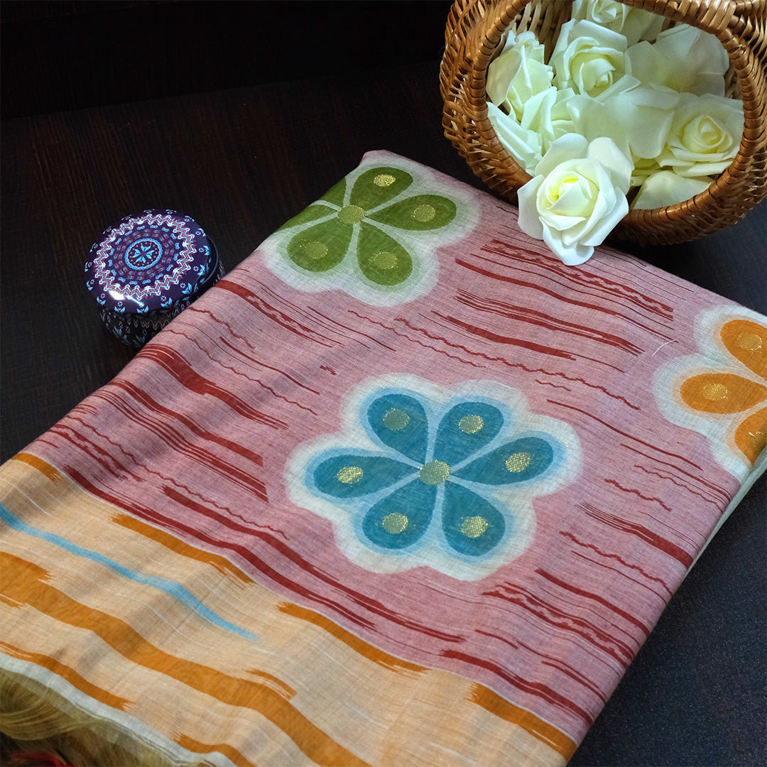 This elegant saree features a warm peach-rose linen-silk base with a soft, lightweight drape. Adorned with abstract floral motifs in teal blue, olive green, and sunset orange, it radiates artistic charm. Subtle wave patterns and a striped pallu in mustard, orange, and ivory add vibrance, while rust-red tassels complete the look—perfect for festive and daytime occasions.